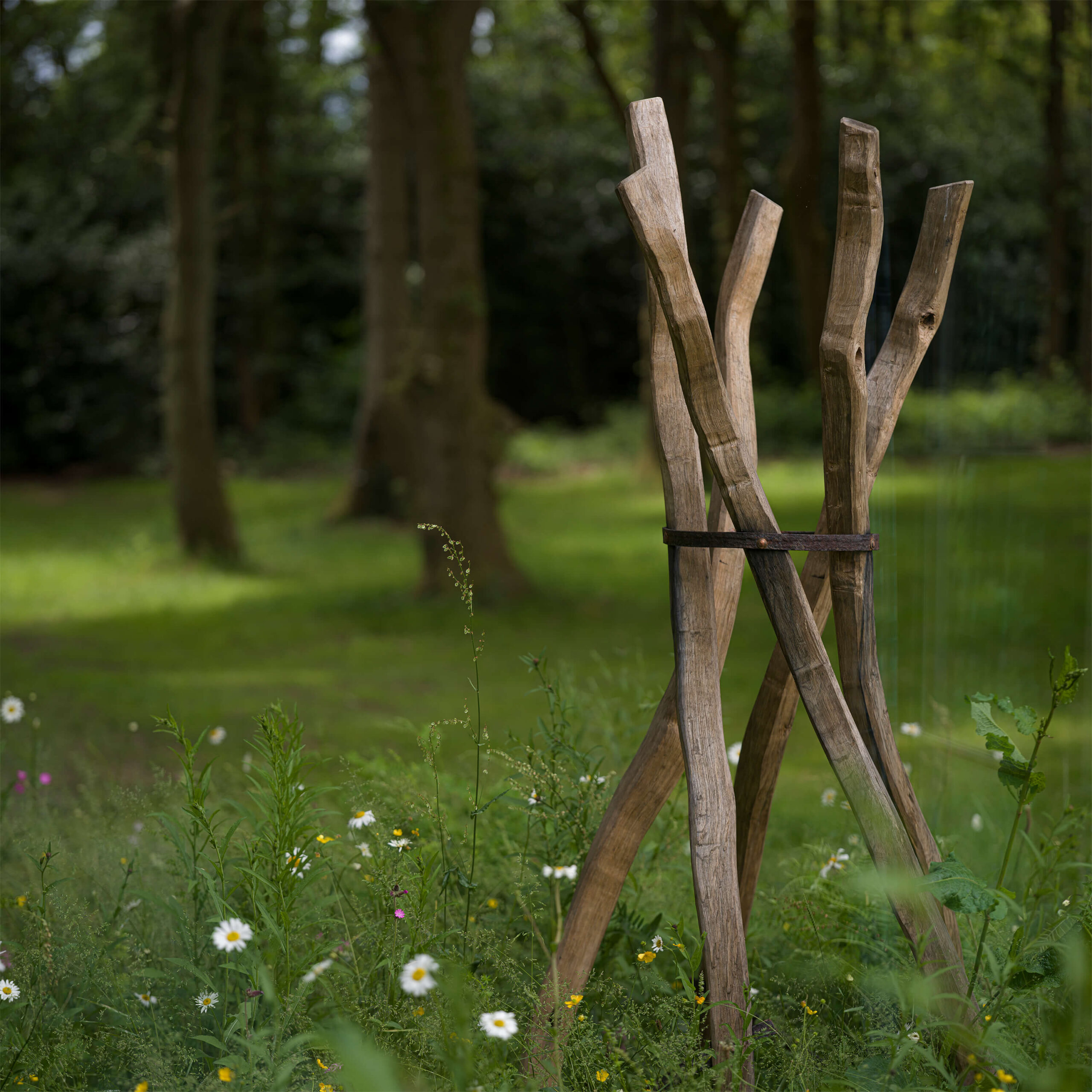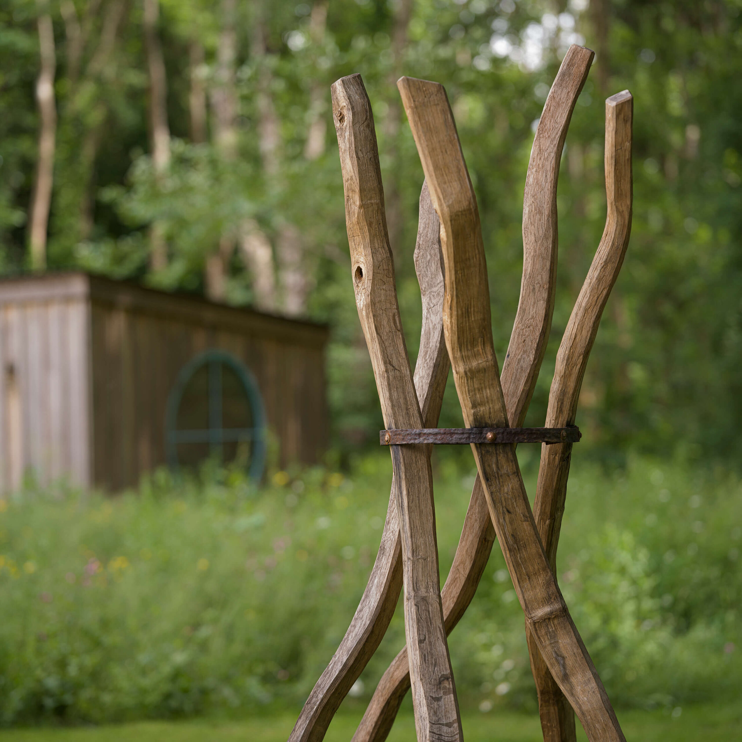 Cleaving wood along the grain reveals natural shapes hidden inside a tree. The five uprights of the obelisk are split from the same log, which means the curves seamlessly match and move together. The obelisk is bound with reclaimed wrought iron and fixed with traditional copper rivets, both of which, like oak, are very durable.